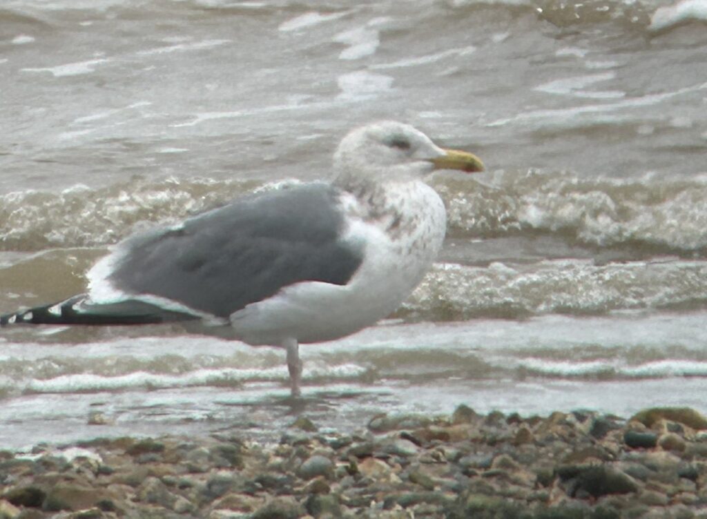 Cloudy, poor visibility, light NE wind. Two Great Crested Grebes were offshore and six Red-breasted Mergansers gathered with the tidal ponds. Two Shelducks flew east and there were four Teal and four Shovelers on the Marsh Pool and 30 visible Snipe. Other waders included a high count of 60 Oystercatchers on the beach, with 11 Sanderlings and 20 Curlews also on the beach. No Ringed Plovers or Dunlin were noted. A distinctive Herring Gull of the race argentatus (from Sandinavia and the Baltic) was on the beach.